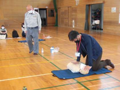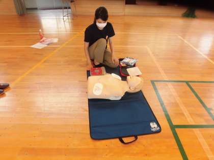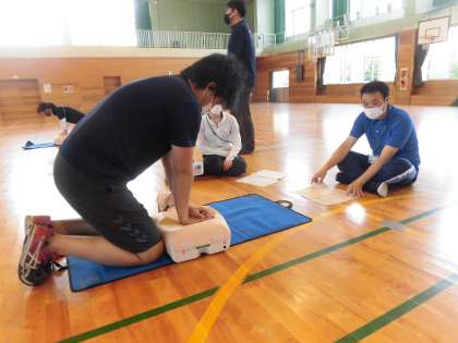 水泳学習を安全に行い、万が一の事態にもしっかり対応できるよう、富山市消防局の方をお招きし、AED講習会を行いました。