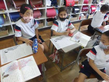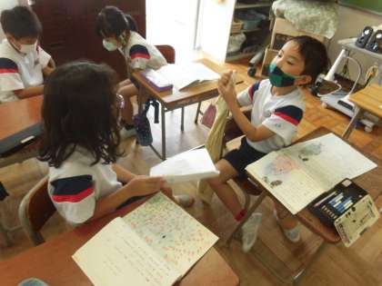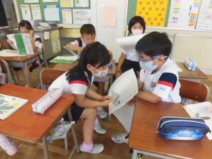 国語科「スイミー」の学習では、場面ごとにスイミーの気持ちを想像しながら読みました。写真は、「スイミーは〜な気持ちだったと思うよ。」という自分の考えをペアの人と伝え合っている様子です。