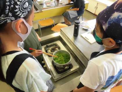 5年生 調理実習〜ゆで料理〜 公開日 2021/06/29 更新日 2021/06/29 5年生 調理実習で、「ほうれん草」のゆで調理を行いました! 班で協力して実習に取り組んでいました。 「家のは、いつも醤油かも!」 「醤油より昆布つゆの方がおいしい」 など、調理実習を通して様々な学びをしたり 自分の家の普段の料理を考えたりしている姿が見られました!