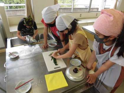 5年生 調理実習〜ゆで料理〜 公開日 2021/06/29 更新日 2021/06/29 5年生 調理実習で、「ほうれん草」のゆで調理を行いました! 班で協力して実習に取り組んでいました。 「家のは、いつも醤油かも!」 「醤油より昆布つゆの方がおいしい」 など、調理実習を通して様々な学びをしたり 自分の家の普段の料理を考えたりしている姿が見られました!