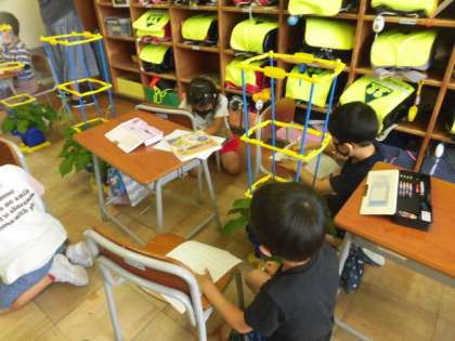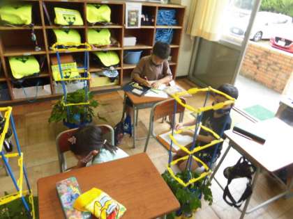 アサガオのツルがのびてきたので、みんなで支柱を立てました。