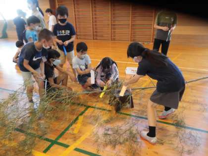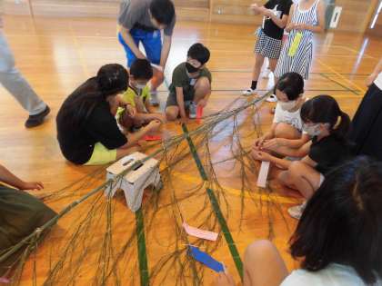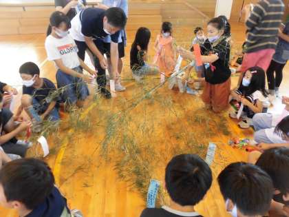 七夕 公開日 2021/07/02 更新日 2021/07/02 校長室から 一人一人が願い事を書いた短冊を赤・白・青・黄の4つの団に分かれて竹につけました。子供たちは、願いが叶いますようにと心で願いながら、取り付けていました。竹は来週、児童玄関に飾る予定です。