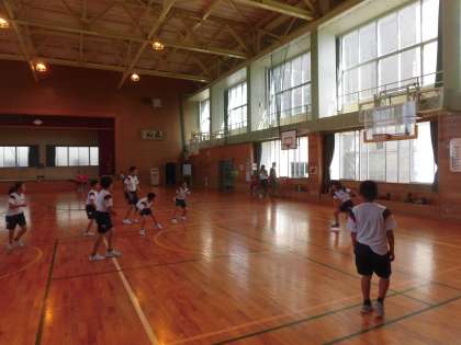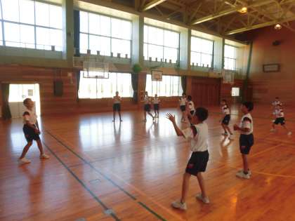 投げる練習をした後、試合をしました。接戦になり、とても盛り上がりました。異学年同士でも声を掛け合い、楽しく活動することができました。