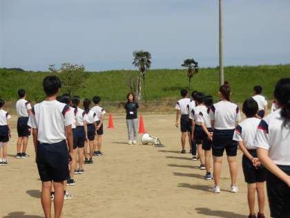 神明チャレンジ陸上校内記録会を行いました。校長先生の話を聞いた後、まずは、50m走の記録を測定しました。全力で走りました。