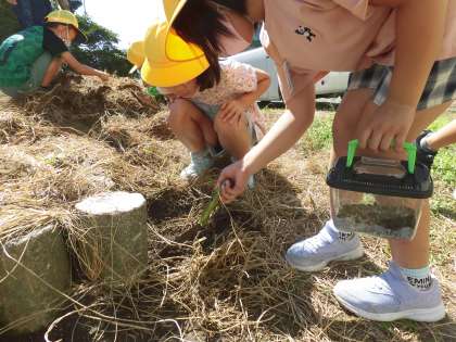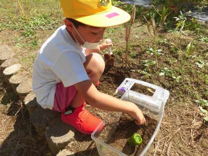 2年生 ダンゴムシ調査隊!2 公開日 2021/09/28 更新日 2021/09/28 2年生 詳しく調べた後に、実際に外に行って、ダンゴムシを探したり、虫かごの中を整備したりしました。枯れ草をめくると、たくさんのダンゴムシが現れて大盛り上がりでした。調べ学習の中で、野菜を食べると知った人は、畑になっている野菜を、虫かごの中に入れてあげていました。