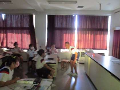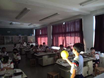 今日は理科室に暗幕を引いて、ボールを月と見立てて観察しました。
