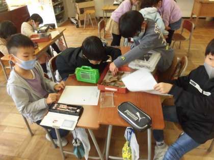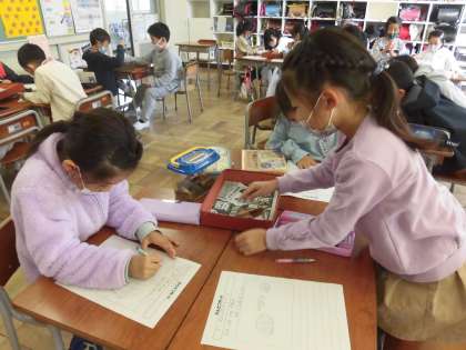 教室でダンゴムシを詳しく観察しました。足は14本あることが分かりました。歩いている様子や、丸まっている様子など、詳しく見ながら観察カードを書きました。