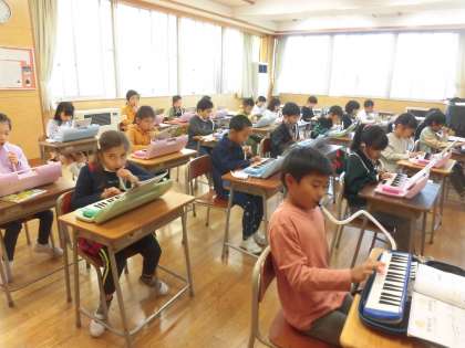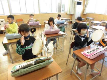 音楽の学習では「山のポルカ」の合奏をしました。これまで練習してきた、楽器でのリズム打ちと、鍵盤ハーモニカの演奏を組み合わせました。子供たちは、練習すると少しずつ上手になることに喜びを感じています。鍵盤ハーモニカの演奏では「3段目まで止まらずにできた!」「最後までできた!」など、嬉しそうに話しています。これからも、いろいろな楽器を使って学習をしていきたと思います。
