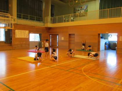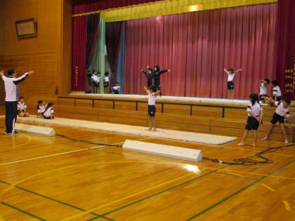 3年生は学習発表会に向けて、マット運動と跳び箱を練習しています。みんなで動きをそろえたり、曲に合わせて回転したりするなど、3年生で一丸となってがんばっています。