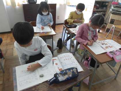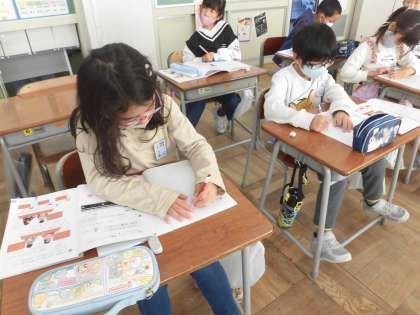 算数の時間は「かけ算」の学習をしています。この時間は、2×8や6×3など、いろいろなかけ算の式を、図で表す活動をしました。式から、「1つ分の数」「いくつ分」を捉えて書くことができました。授業後の休み時間には、さっそく、自学ノートにかけ算の式を書き、その式について絵で表している子もいました。