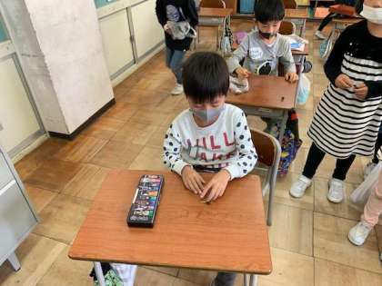 生活科の時間では、以前に五福公園で拾ってきたどんぐり等を使って、どんぐりごまを作りました。つまようじの付け方や、回し方等を工夫して作っています!