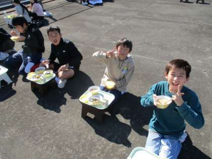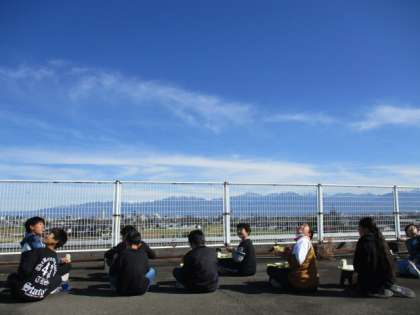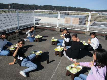 こんな絶好の日はない!ということで、給食の時間に特別に屋上に給食を持って行って食べました。