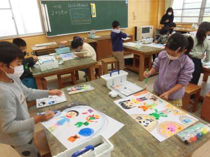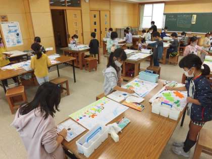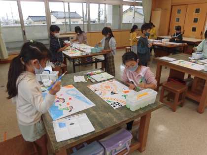 2年生 図画工作科「だいすきな ものがたり」 公開日 2021/11/10 更新日 2021/11/10 2年生 国語科で学習したお手紙に登場する、「かえるくん」と「がまがえるくん」と「自分」を書きました。一緒にどんな場所に行きたいか想像を膨らませて描きました。