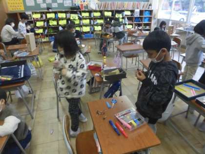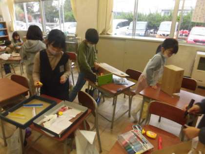 先週に引き続き、おもちゃ作りをしています。もっと、「長く回るどんぐりごまにしたい」「もっと大きなどんぐりころころをつくりたい」などと、様々な工夫を考えて、おもちゃを作っています!