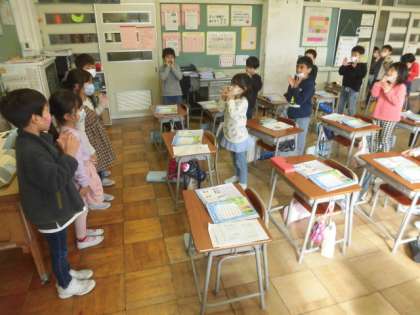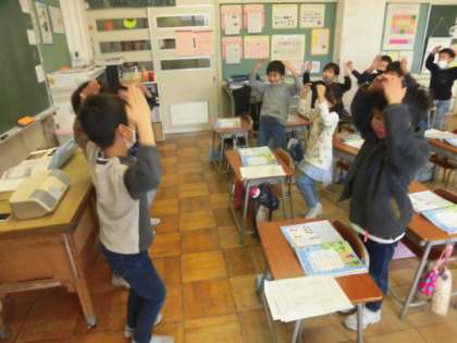 音楽の授業では、歌に合わせて動きを考えました。グループの友達と一緒に話し合い、どんな動きが歌詞に合うのかを考えながら発表できました。