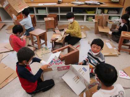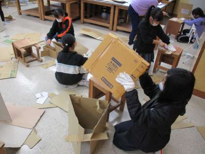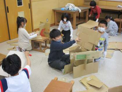 3年生 ダンボールをつなげてみたよ 公開日 2021/11/24 更新日 2021/11/24 3年生 図画工作科の時間に、ダンボールカッターでダンボールに切り込みをいれて、つなげて楽しみました。たくさんつなげてみたり、好きな形に切って、つなげてみたりするなど、制作を楽しんでいました。