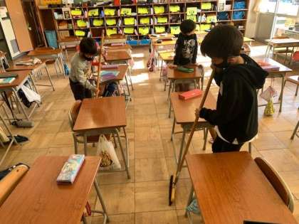 掃除教室の後に、1年1組教室に戻ってくると、自分たちの教室を掃除している1年生の姿が見られました。自分たちで自分たちの教室をきれいに保とうとする気持ちが、すばらしいです。