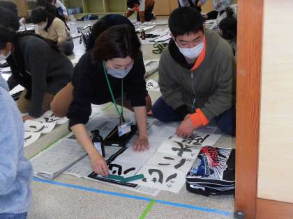 6年 書初練習 公開日 2021/12/13 更新日 2021/12/13 校長室から 3学期の書初大会は、毛筆の3年生から6年生が体育館に集まって行い、硬筆墨の1、2年生は、教室で行う予定です。 3年生から6年生は、床で書くことが初めてなので、今週から生活科室で練習します。司書の村上先生は書道に長けておられるので、書初の指導をしてもらいました。そのおかげで、みんな勢いのある文字が書けるようになりました。