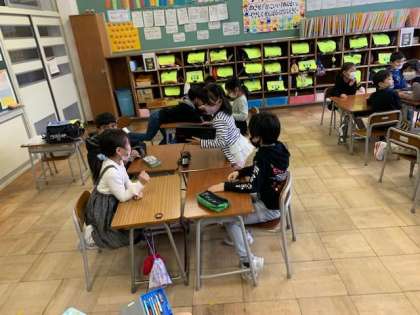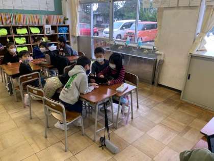 お題となる顔を部分を順番に描き、班のみんなで顔を完成させました。