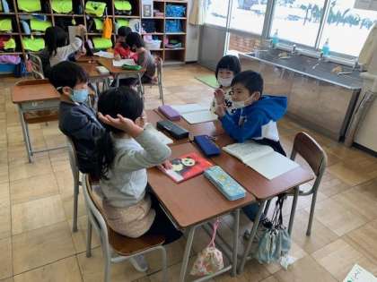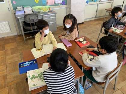 国語の時間には、友達の話を聞いて質問等をし合う学習をしています。第1回お話タイムのテーマは、「好きなメニュー」でした。なぜそのメニューが好きなのか、どんな具材が好きなのかなど、友達に質問をしていました。
