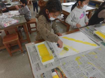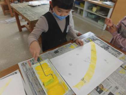 今日は、2色のインクをローラーで付けました。少しずつ完成に近づいています。
