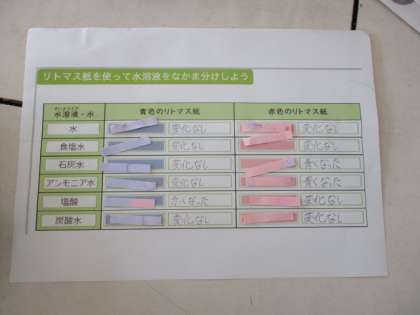 水溶液には酸性・中性・アルカリ性があることを知り、リトマス紙を使ってそれぞれの性質を見極めました。