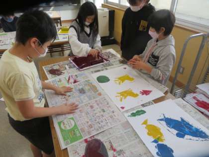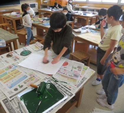 彫刻刀で彫り終わった子供から色をつけ始めました。