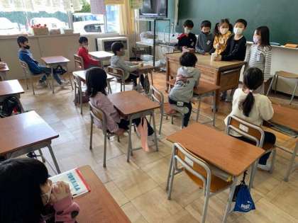 飾り付け係の子供たちが、学級のみんなに教室の飾りをつくってもらおうとお願いをしています。どんな飾りを作るのか、みんなにくじ引きで選んでもらっている様子です!