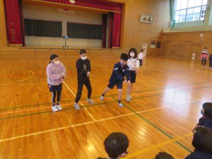 3年生の体育では、いろいろな物や場面の様子を想像して体を動かしたり、曲にあった動きを考えて体を動かしたりしました。