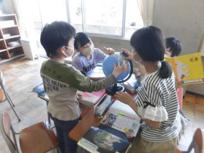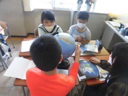 今日から、5年生の社会科の学習を始めました。今日は、地球儀を使って、日本の位置や日本の国土の様子を調べました。友達と相談しながら協力して調べていました。