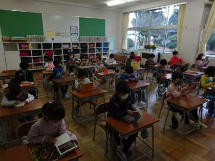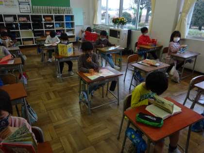 今日の朝は、読書をしました。文章の長い本を読んでいる子、図鑑や伝記を読んでいる子など、集中して本を読んでいました。読書を通して、本の世界に入り、体験できないようなことも本の世界で味わってほしいです。