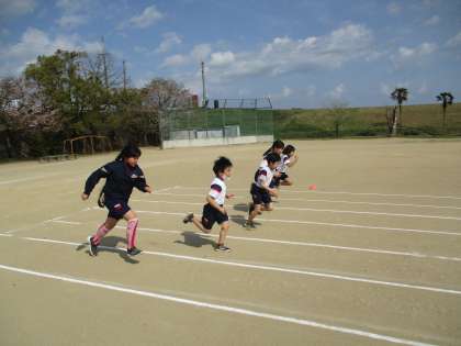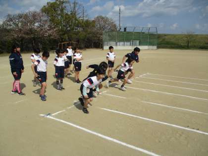 4年生は体育の時間に、短距離走のスタートの練習をしました。速く走るためのスタートのポイントをよく聞いて、久しぶりの短距離走を楽しんでいました。これから、少しずつ走る数を増やして、走ることに自信を付けていってほしいです。