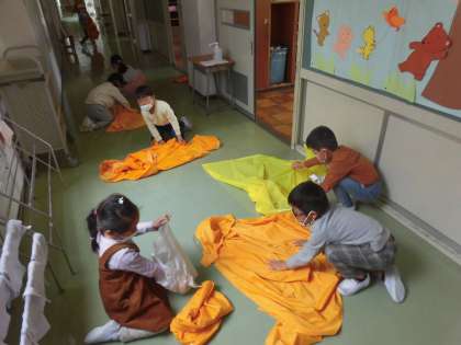 雨の日も増えてきました。下校前には、朝着てきた雨具をたたんで持ち帰ることがあります。自分たたんで、袋にしまえるように練習をしています。ご家庭でも、時間があるときには、雨具の使い方の練習をお願いします。