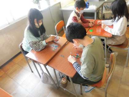 算数の時間には、体積の学習をしています。今日は、展開図を組み立てると、1立方センチメートルの箱がいくつ分になるのかを数えました。ペアの友達と協力して、数えることができました。
