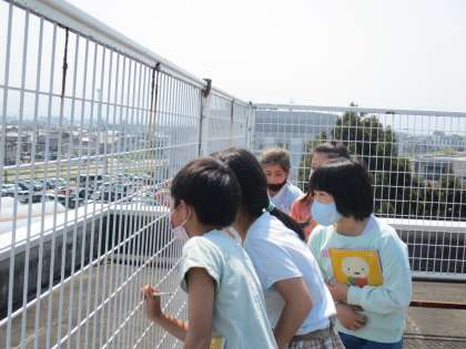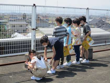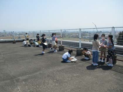 社会の時間では、学校のまわりの様子について学習しています。昨日は、屋上から学校のまわりに何があるのかを見ました。自分の家や建物を、見える方位を確認しながら記録していました。