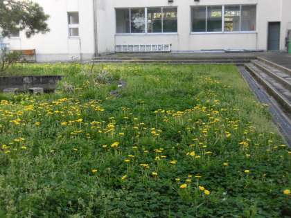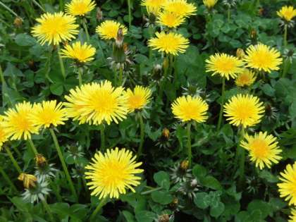 中庭に、タンポポが群生しています。今は、黄色い花が咲き乱れて、とても見事な風景です。
