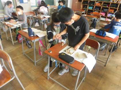 算数の時間に、体積の求め方について学習しています。今日は、公式を基に様々な立体の体積を求めました。友達と相談しながら、問題を解きました。