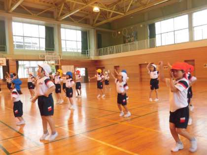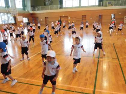 朝トレで、運動会のダンスを練習しています。リズムに合わせて、楽しく踊っています!