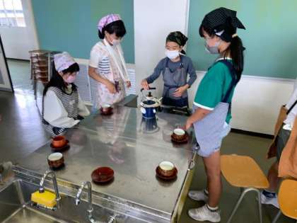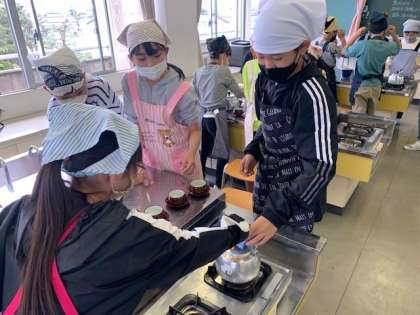 家庭科の時間に、お茶をわかしました。やかんでお湯をわかし、急須でお茶を入れました。運動会の練習が続く中、ほっとする時間となりました。家でも、家族の方に、お茶を入れてみるとよいですね。