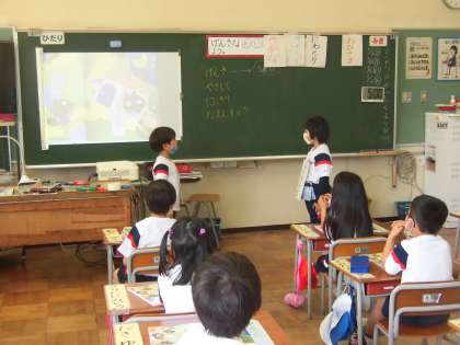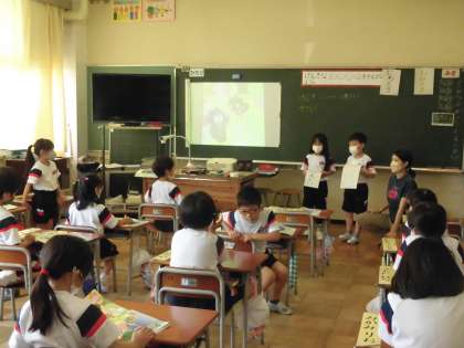道徳の時間に、元気なあいさつについてべんきょうしました。教科書に出てくる動物になりきって、いろいろなあいさつを発表しました。