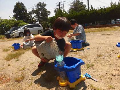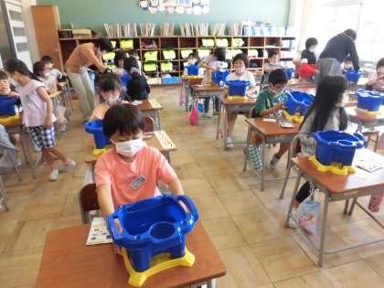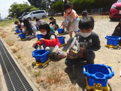 生活科の学習で、アサガオの種を植えました。みんな、芽が出るのを楽しみにしています。