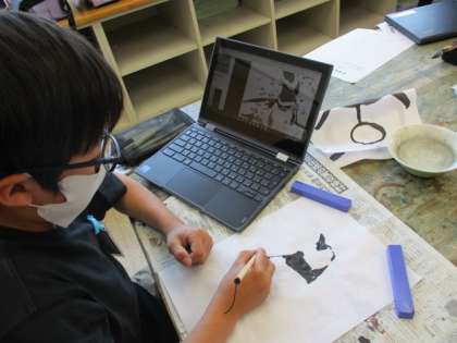 図工の時間に、水墨画にチャレンジしています。墨の濃淡を感じながら楽しく活動していました。墨で絵を描くのは難しいですね。歯ブラシやスポンジ等、色々な道具を使ってみると不思議な模様にもなりました。