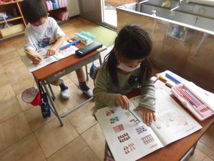 算数の時間に10になる数を考えました。今ままで覚えた組み合わせを思い出しながら、10になる組み合わせを見つけて丸で囲みました。