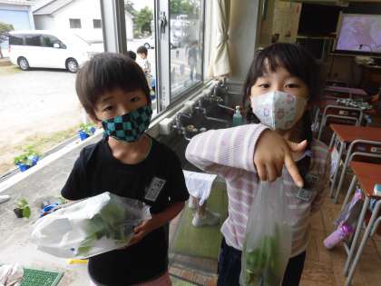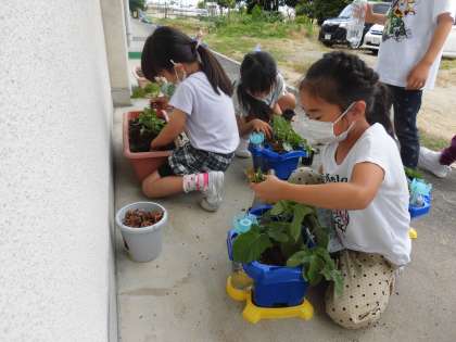 アサガオがどんどん成長してきています。子供たちとこれからのお世話の方法について話合うと「鉢が狭いはら、土ごとお引っ越ししたらいい!」という意見が出てきました。お引っ越ししたい人は、家に持ち帰ったり、学校にある大きな鉢に植え替えたりしました。そのまま、たくさんの芽を育てたい人は、水やりをがんばっています。