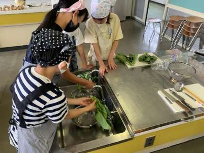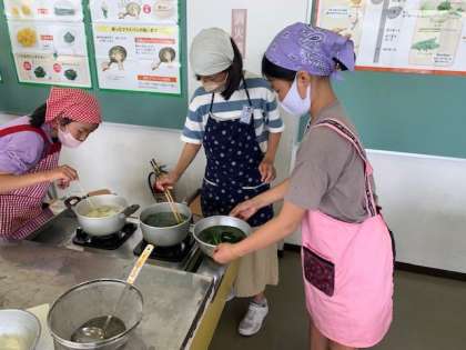 今日は、ゆでる調理についての調理実習をしました。青菜のおひたしと、ゆでいもを作りました。