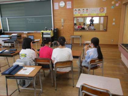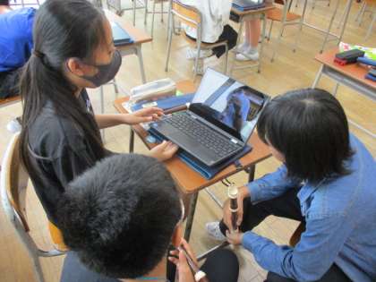 音楽の授業では、リコーダー練習をしています。クロームブックの動画や楽譜を見ながら協力して教え合ったり聞き合ったりする様子が見られました。