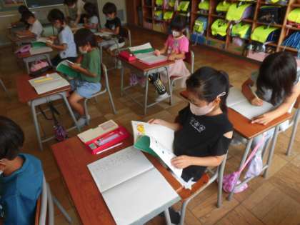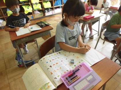 算数や国語の時間に自学ノートの使い方を紹介しながら、書く練習をしています。この日は、「ひらがなしりとり」に挑戦しました。慣れてきたら、お家に持って帰って、自分で考えた学習に取り組みたいと思います。