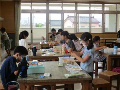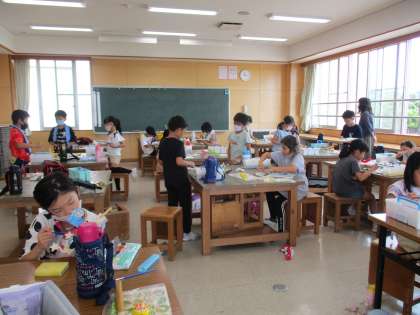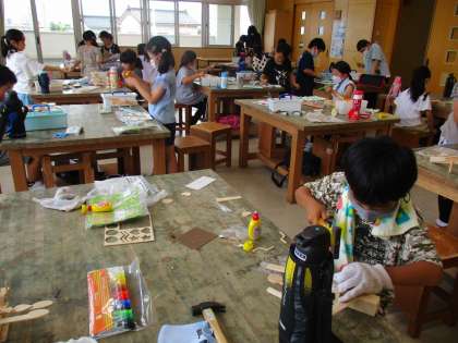 3年生 図画工作科 公開日 2022/07/05 更新日 2022/07/05 3年生 図工では、釘打ちに挑戦しています。まっすぐ打ち込むことはなかなか難しいようです。何度も釘を立て直しながら、丁寧に作品を作っています。