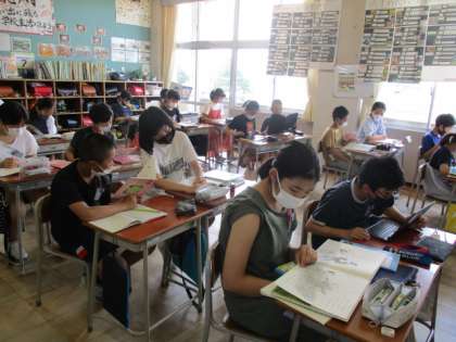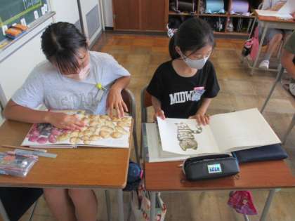国語の時間に絵本を使ってブックトークをしています。今回は、絵本の魅力を伝えるビブリオバトルを予定し、それに向けて絵本のテーマや言葉の表現などに着目して物語の世界を感じています。