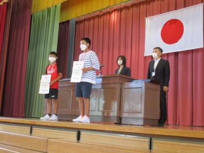 始業式が終わり、県民体育大会の種目で活躍した5年生児童2名に受賞伝達を行いました。2学期も、活躍を期待しています。
